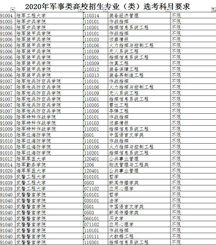 《河北省教育厅关于公布普通高校本科招生专业选考科目要求(3+1+2模式)的通知》中没有军校的专业选考科目要求,下面以2020年在山东省新高考(“3+3”模式)招生的军校选考科目要求为参考,总结了以下几个规律,供参考。