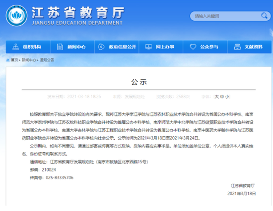 南京中医药大学翰林学院与江苏医药职业学院合并转设为省属公办本科学校向社会公示。