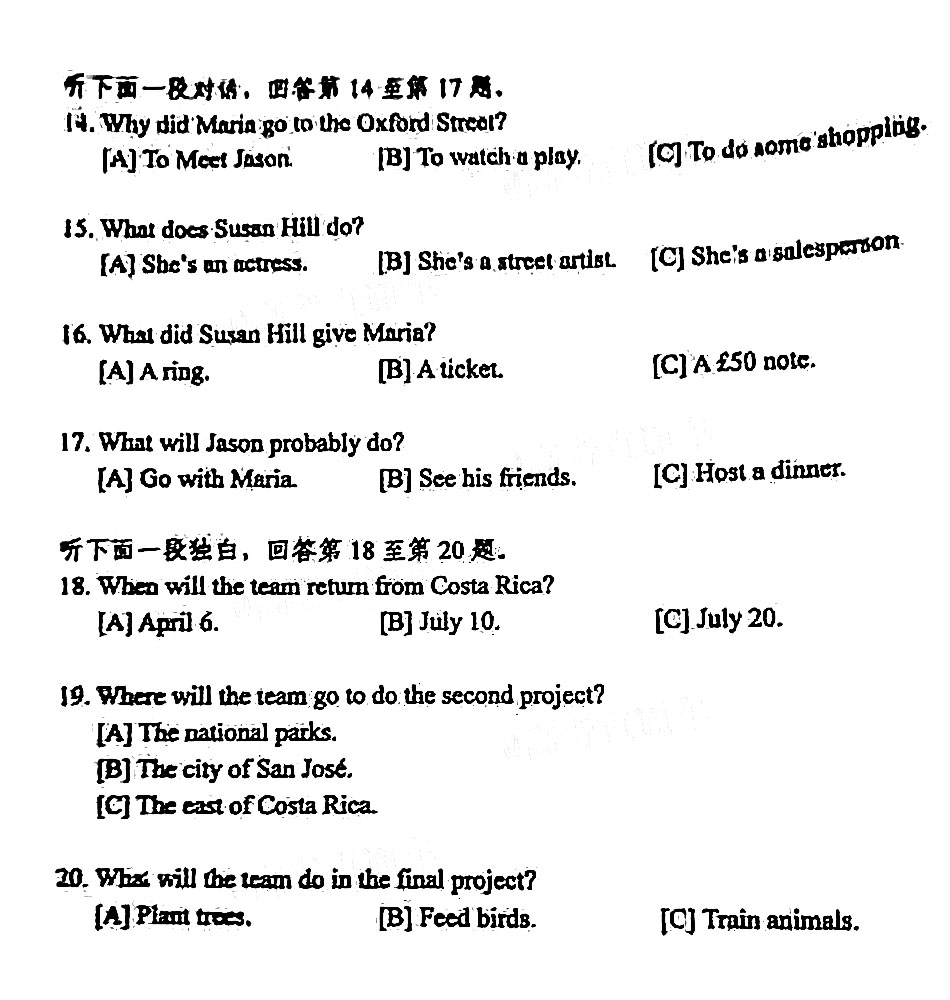 2021年云南贵州高考英语第二次听力考试试题及答案