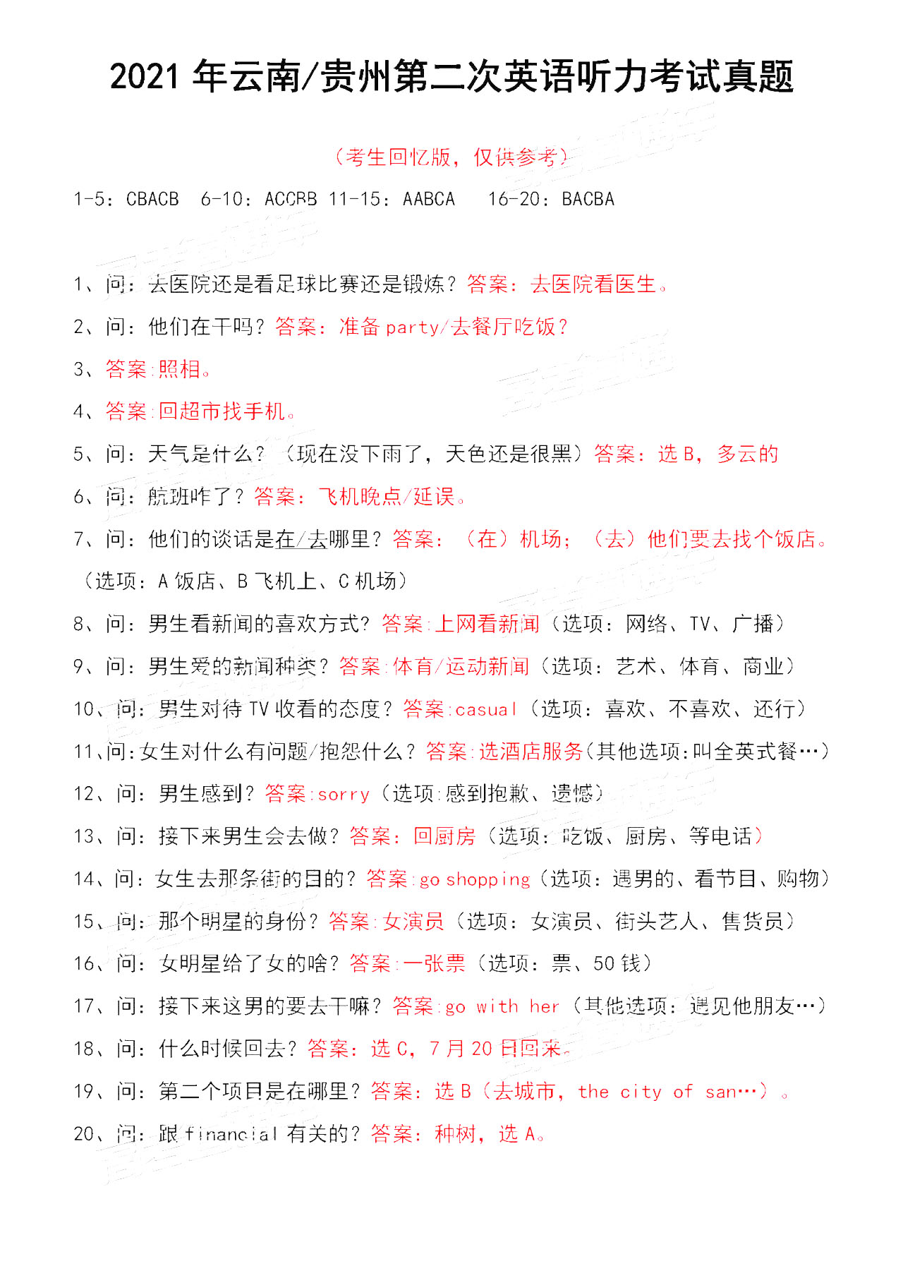 今天,东南教育网小编为大家带来了2021年云南贵州高考英语第二次听力考试试题及答案,希望能帮助到大家,一起来看看吧!