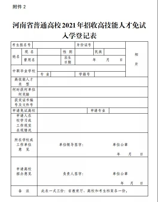 2.河南省普通高校2021年招收高技能人才免试入学登记表