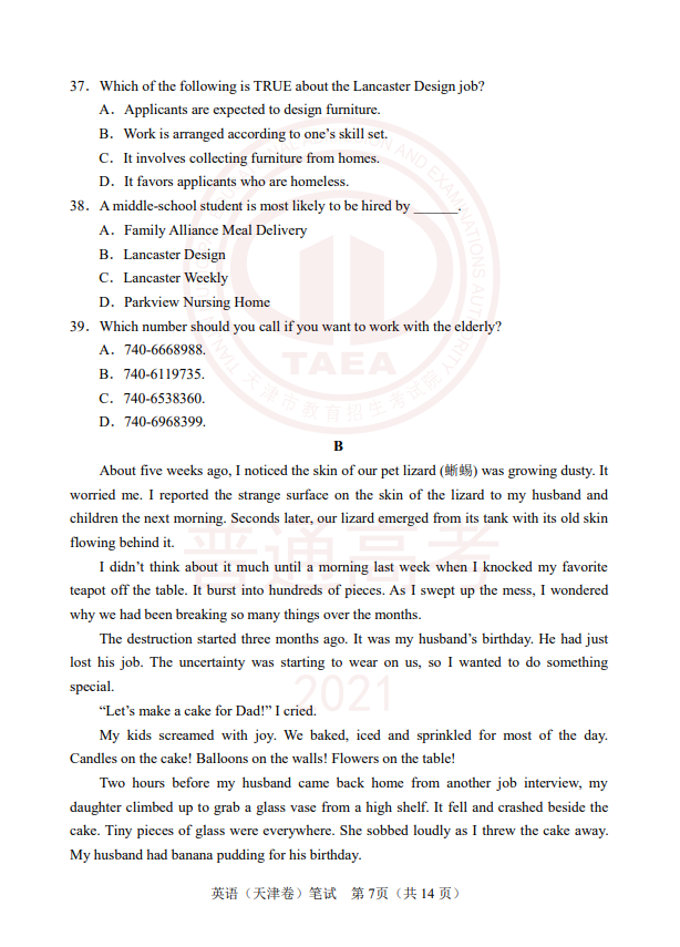 今天,东南教育网小编为大家带来了2021年3月高考英语试卷及参考答案(天津卷),希望能帮助到大家,一起来看看吧!