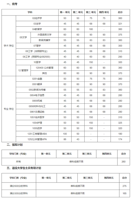 单科成绩不限,总分不低于对应统考的学科门类(专业)学校分数线的90%(四舍五入取整)。