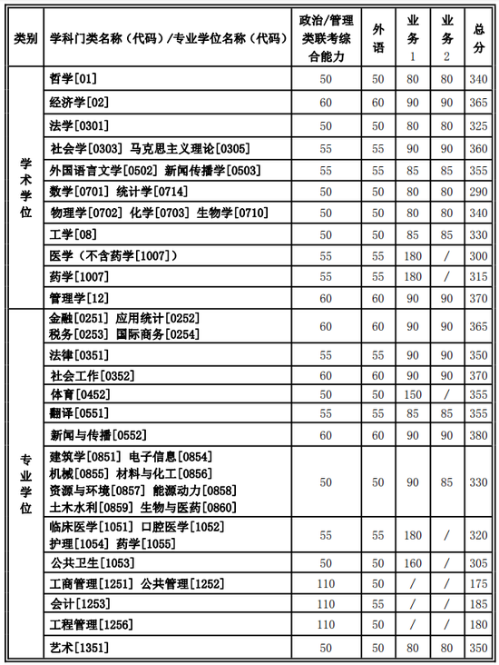 1.学校复试基本分数线为相应学科门类(学科)/专业学位的最低分数线,单科、总分须同时满足要求。各招生学院(部、中心)可根据其招生计划和生源等情况,按一定的差额复试比例上浮复试分数线并确定复试考生名单。