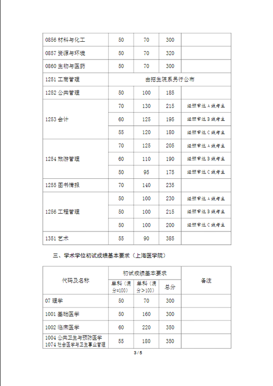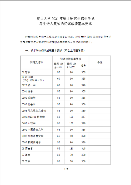 复旦大学2021年硕士研究生招生考试考生进入复试的初试成绩基本要求