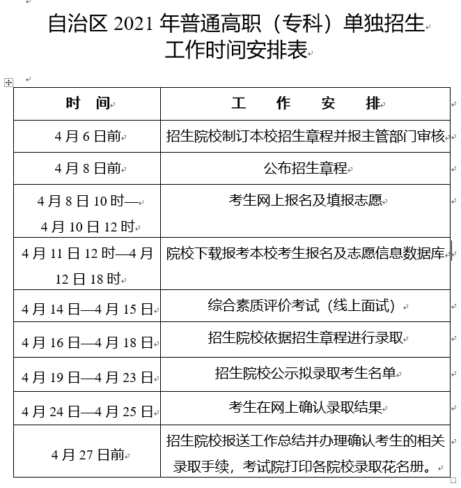2.自治区2021年普通高职(专科)单独招生工作时间安排表