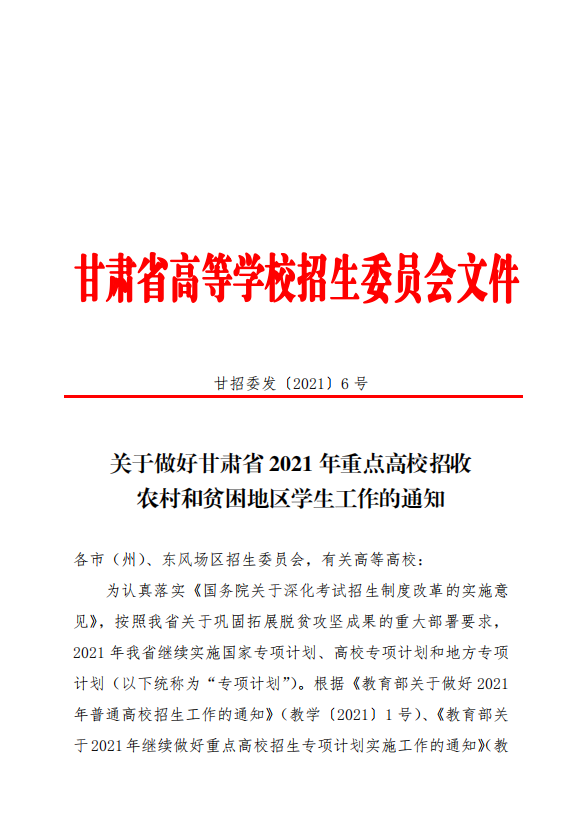 本文标题:2021年甘肃重点高校招收农村和贫困地区学生工作安排