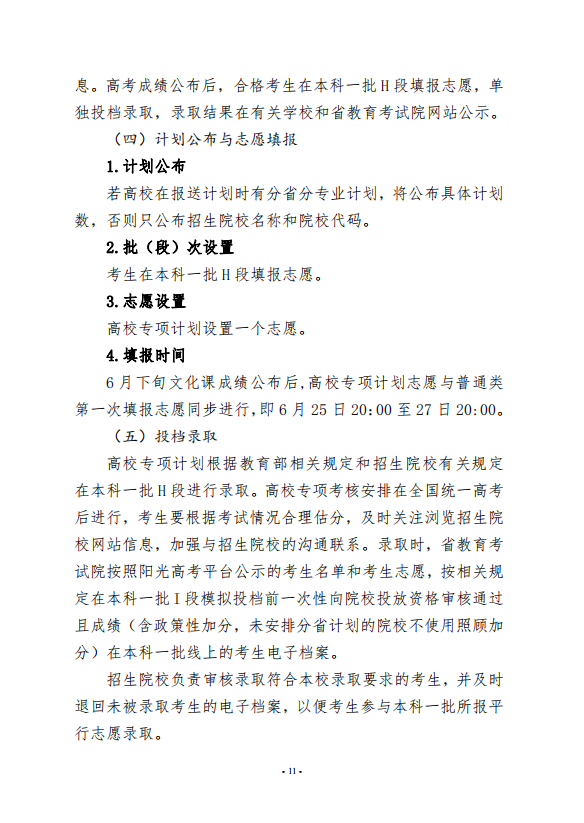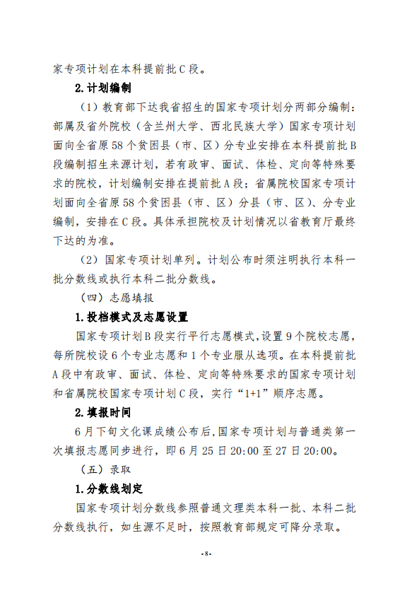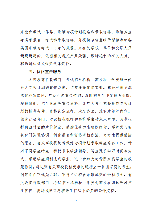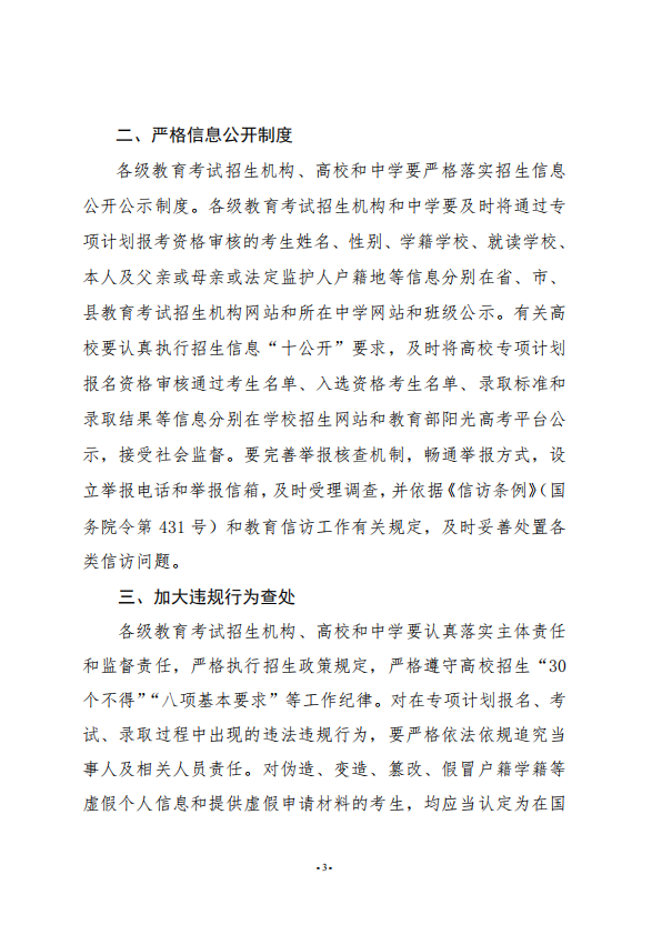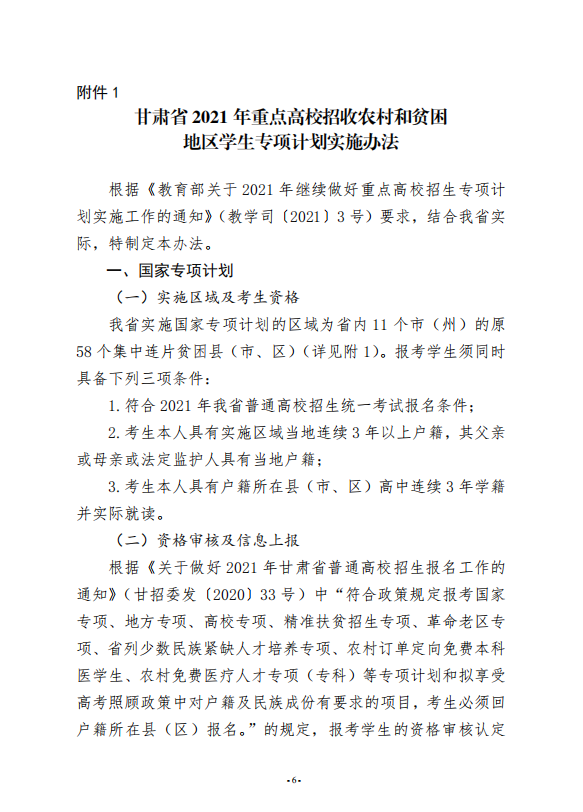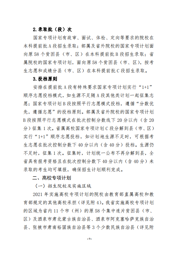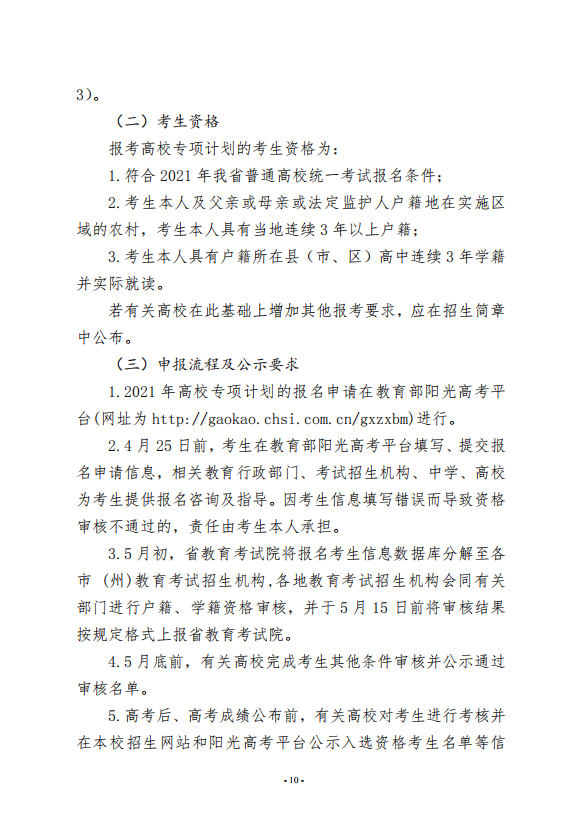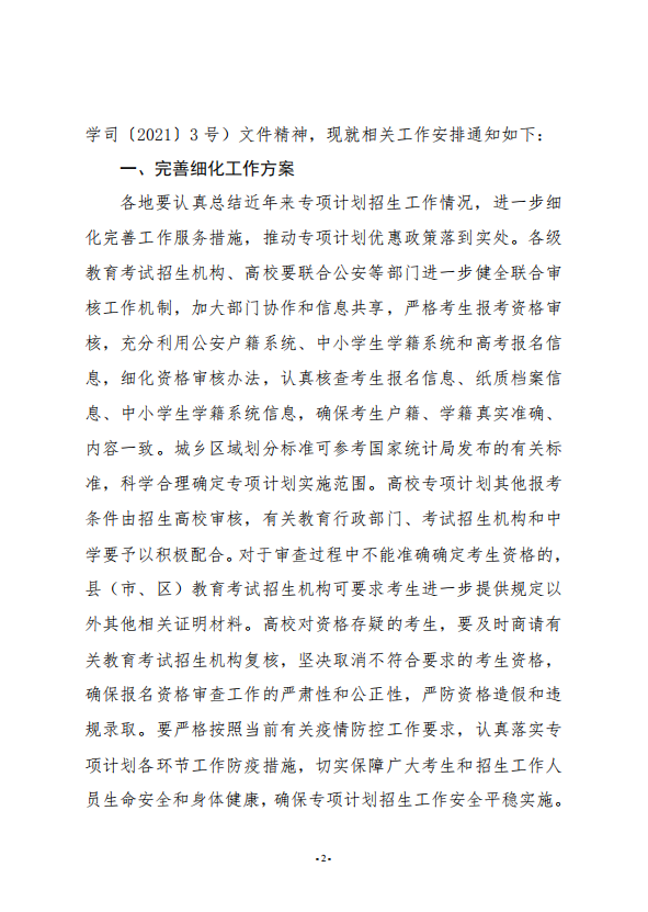为认真落实《国务院关于深化考试招生制度改革的实施意见》,按照我省关于巩固拓展脱贫攻坚成果的重大部署要求,2021年我省继续实施国家专项计划、高校专项计划和地方专项计划(以下统称为“专项计划”)。根据《教育部关于做好2021年普通高校招生工作的通知》(教学〔2021〕1号)、《教育部关于2021年继续做好重点高校招生专项计划实施工作的通知》(教学司〔2021〕3号)文件精神,现就相关工作安排通知如下: