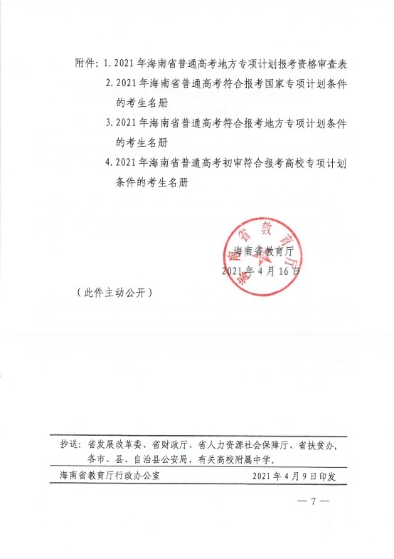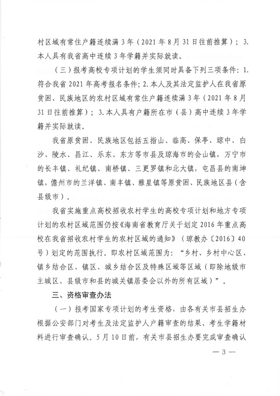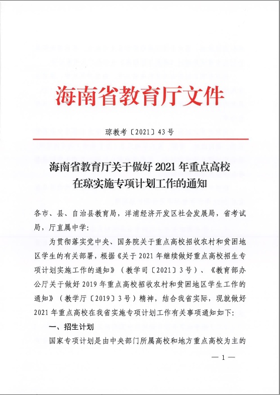 海南省教育厅关于做好2021年重点高校在琼实施专项计划工作的通知
