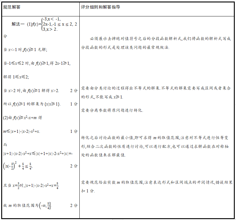 3.写全得分关键:写清解题过程的关键点,有则给分,无则没有分,同时解题过程中计算准确,是得分的根本保证.如本题第(1)问要写出分段函数的形式,分段求解不等式的解集。第(2)问中转化的思想很重要,将原问题转化为求解最值的问题即可,转化的思想是高中数学的重要数学思想之一。