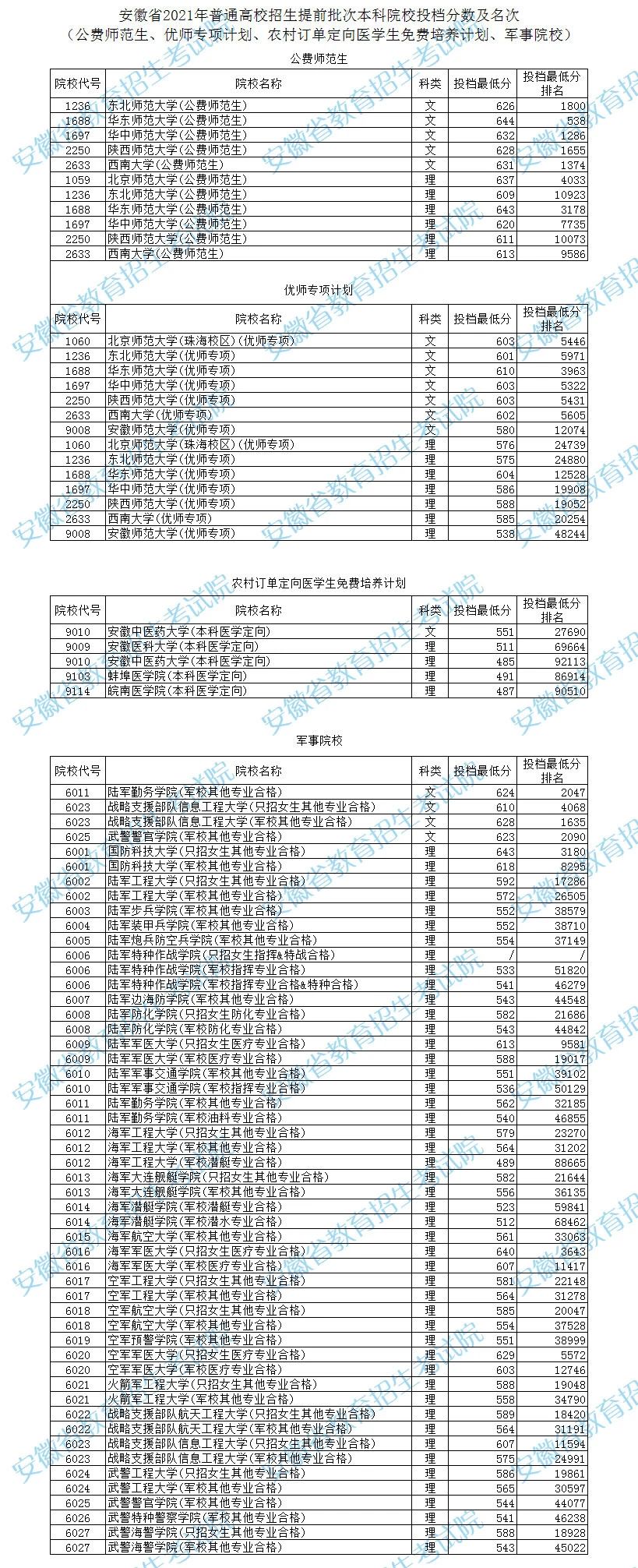 安徽省2021年普通高校招生提前批次本科院校投档分及名次 (公费师范生、优师专项计划、农村订单定向医学生免费培养计划、军事院校)