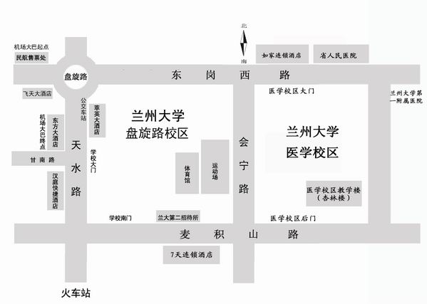 2.飞机场—兰州大学:乘机场大巴至东方大酒店(校门正对面)过马路即到,约一小时车程。