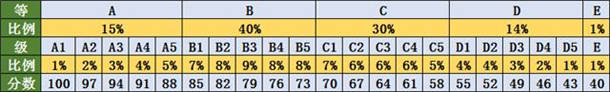 其中,A1级为排名前1%的学生,占比为学生总数的1%,对应的等级分数为100分;A2级为排名前2%-3%的学生,占比为学生总数的2%,对应的等级分数为97分;A3级为排名前4%-6%的学生,占比为学生总数的3%,对应的等级分数为94,依次类推。