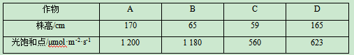 (3)农业生产常采用间作(同一生长期内,在同一块农田上间隔种植两种作物)的方法提高农田的光能利用率。现有4种作物,在正常条件下生长能达到的株高和光饱和点(光合速率达到最大时所需的光照强度)见下表。从提高光能利用率的角度考虑,最适合进行间作的两种作物是___________________,选择这两种作物的理由是___________________。