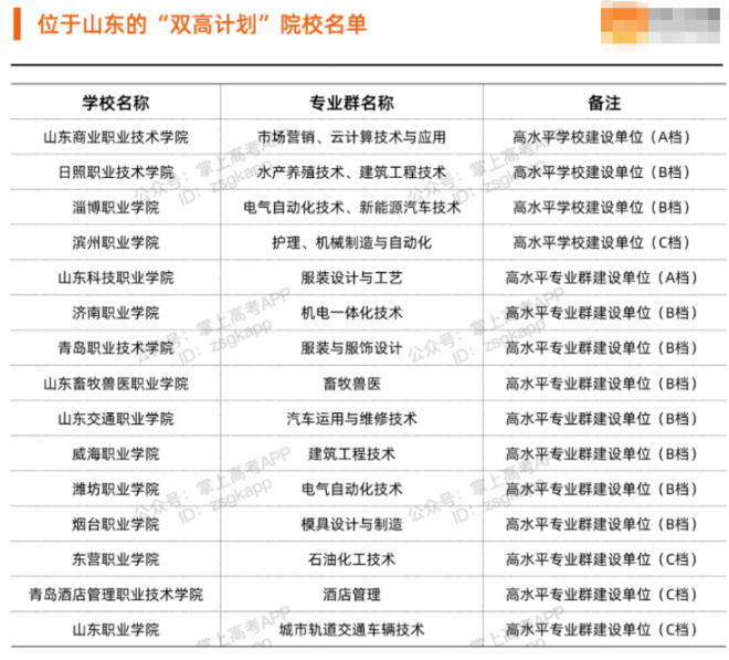 山东省共有15所“双高”高职院校,其中高水平学校建设单位4所(A档1所,B档2所,C档1所),高水平专业群建设单位11所(A档1所,B档7所,C档3所),特色专业群涵盖了云计算、新能源汽车、机电一体化、城市轨道交通等多个方面。