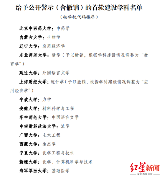 ▲给予公开警示(含撤销)的首轮建设学科名单