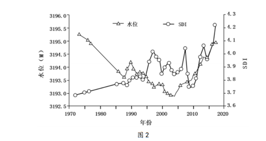 岸线发育系数(简称SDI)是反映湖泊几何形态的指标,其值越大表示湖岸线越曲折。我国某内陆咸水湖,拥有丰富的湖岸线资源,部分湖岸区域沙漠化现象较为明显。图2示意该湖1973—2017年水位和SDI值变化。据此完成8~9题。