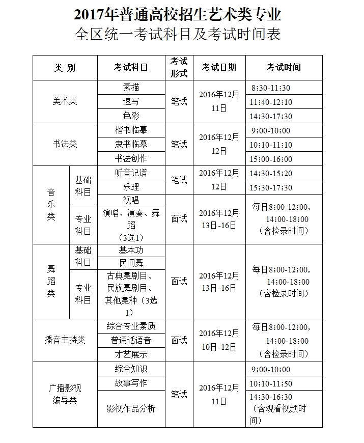 (五)播音主持类专业考试时间:2016年12月10日-12日。