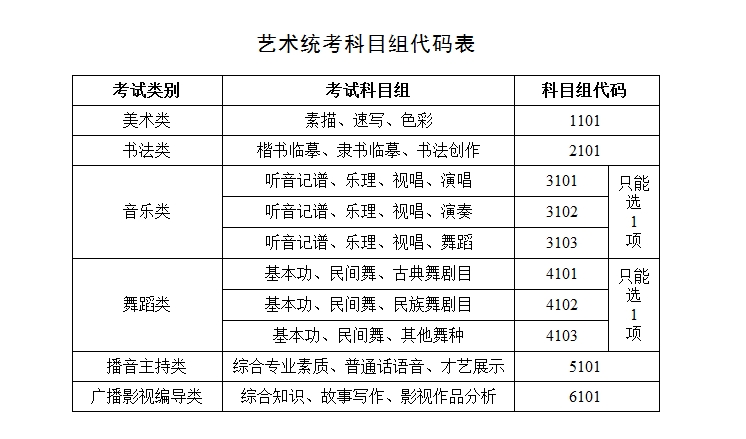 我区2017年普通高校招生艺术类专业全区统一考试(以下简称艺术统考)分美术类、书法类、音乐类、舞蹈类、播音主持类、广播影视编导类等六个考试类别。现将考试有关事项通知如下:
