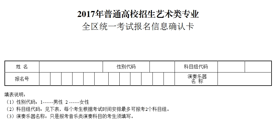 艺术统考报名与2017年普通高等学校招生全国统一考试(简称普通高考)报名同时进行。符合艺术统考报名条件的考生在办理普通高考报名手续时,同时办理艺术统考报名手续,并由当地招生办公室打印《2017年普通高校招生艺术类专业全区统一考试报名信息确认卡》(见附件2)并加盖公章后,交给考生自行保管留用。