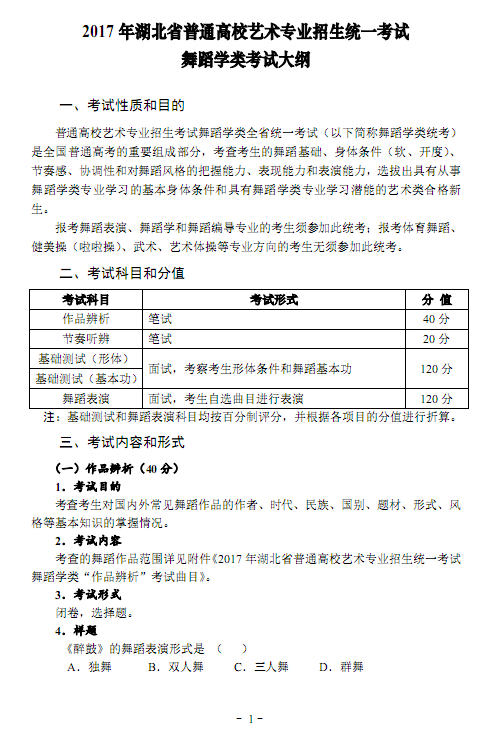 2017湖北艺考舞蹈学类统一考试大纲如下: