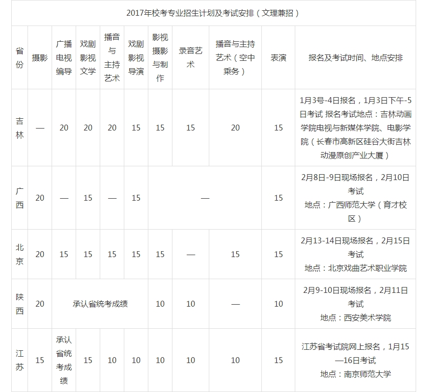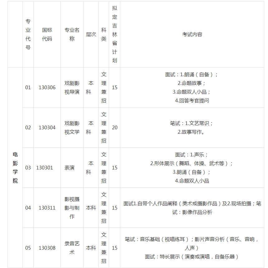 2.以下01-08专业由我校组织专业考试。报名时间:2017年1月3-4日,3日下午-5日进行考试。报名及考试地点:吉林动画学院电视与新媒体学院、电影学院(长春市高新区硅谷大街吉林动漫原创产业大厦一楼)。报名考试费:200元/人.专业