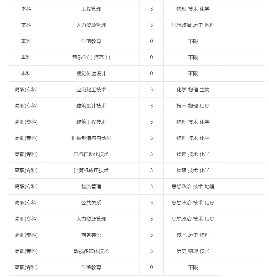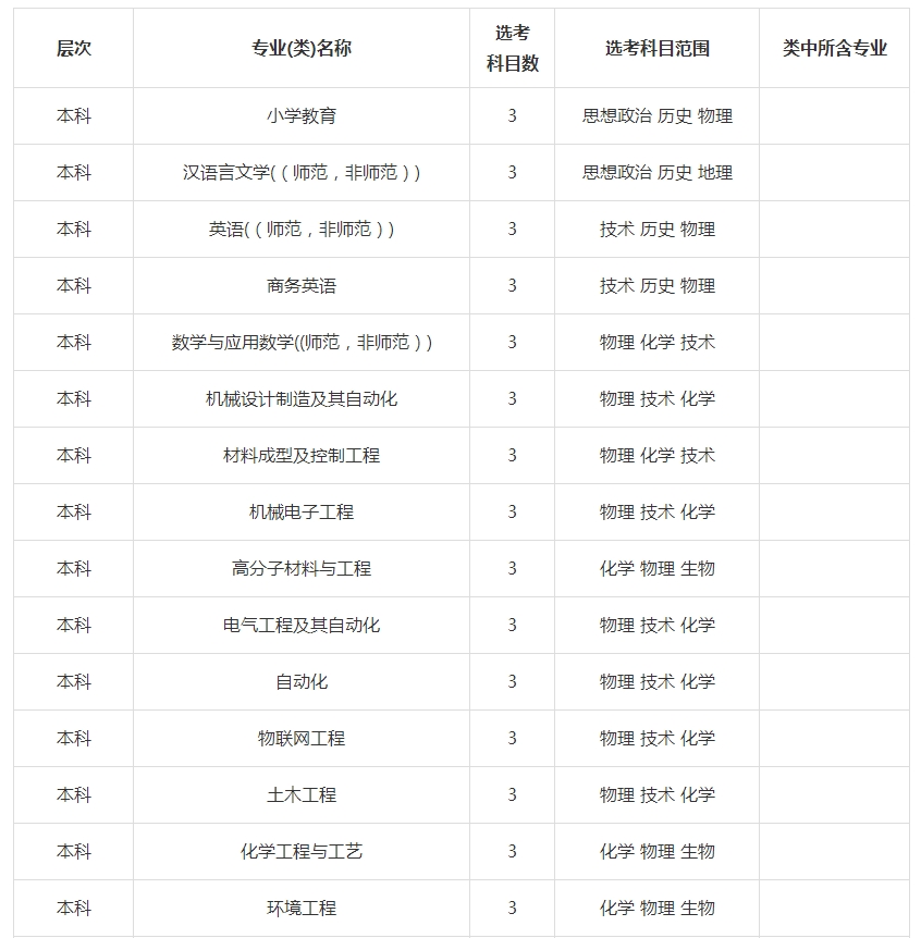 衢州学院2017年在浙招生普通高校专业类选考科目范围